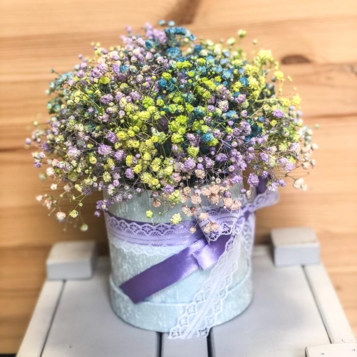 Гипсофила – 7 шт.Шляпная коробка – 1 шт.Оазис – 1 шт.Лента атласная – 2 шт.Пленка матовая – 1 шт.