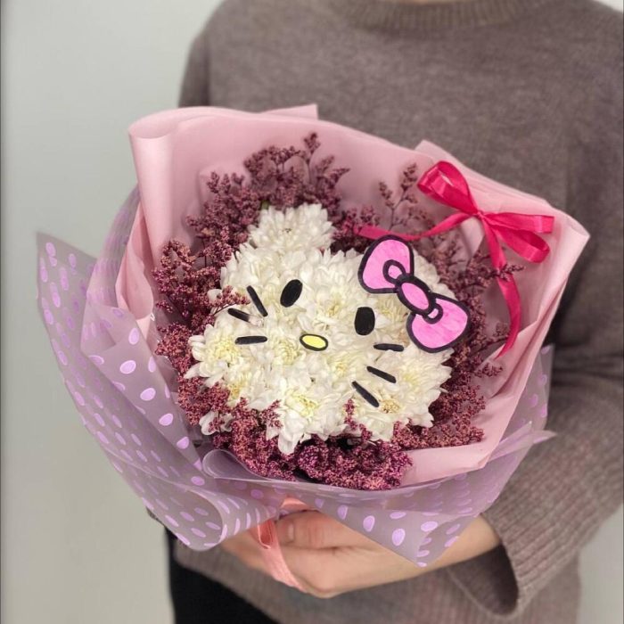 Милый необычный букет Хэллоу Китти поднимет настроение не только ребенку,но и взросломуОткрытка с вашим текстом в подарок