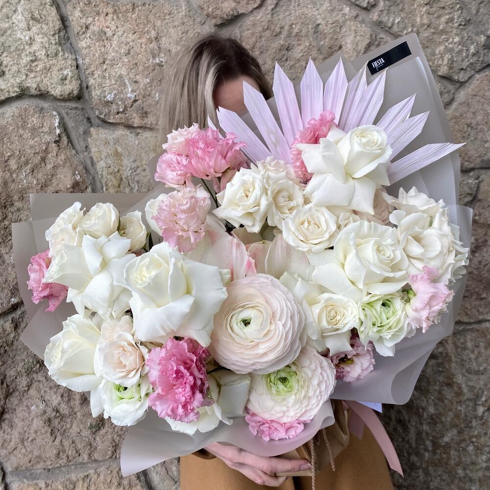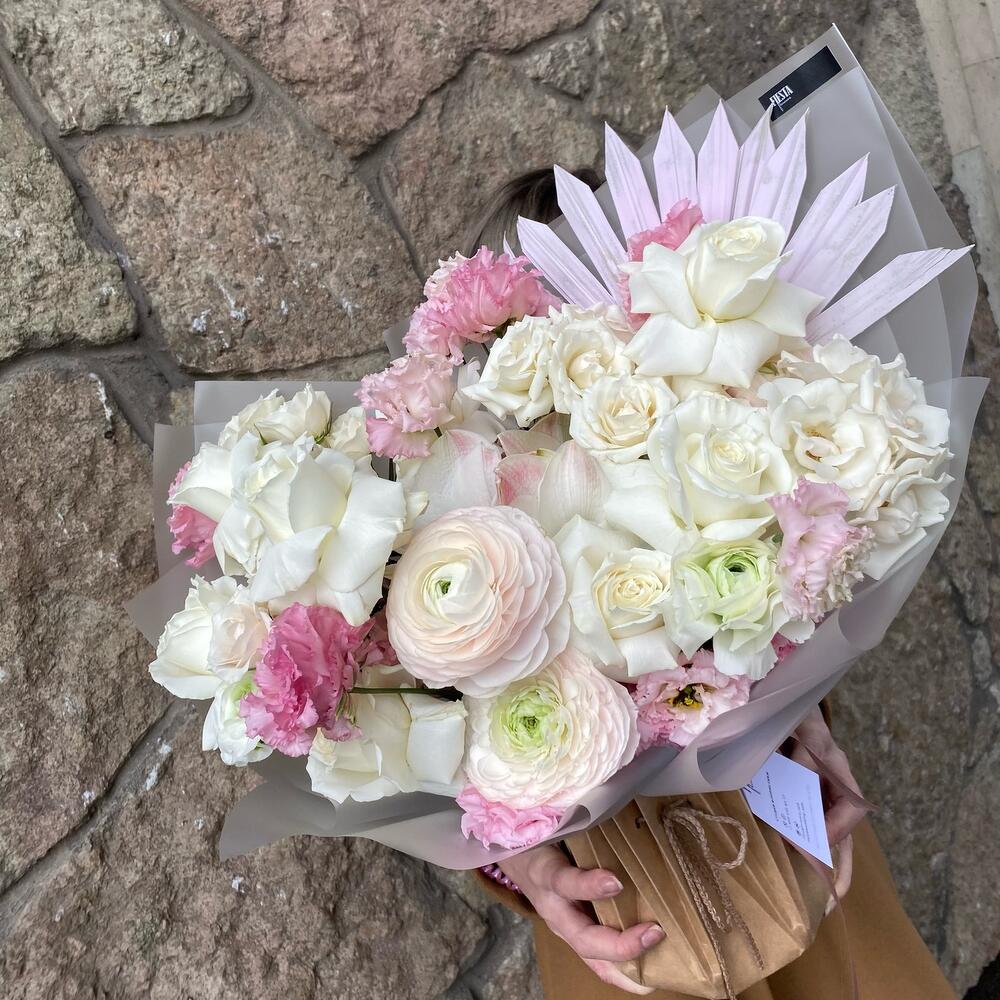 Ранункулюс – 4 шт.Лизиантус махровый – 9 шт.розы белые – 11 шт.розы пионовидные кустовые – 5 шт.