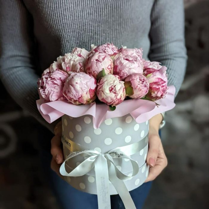 Букет из 19 розовых пионов в дизайнерской коробке “Сара Бернар”