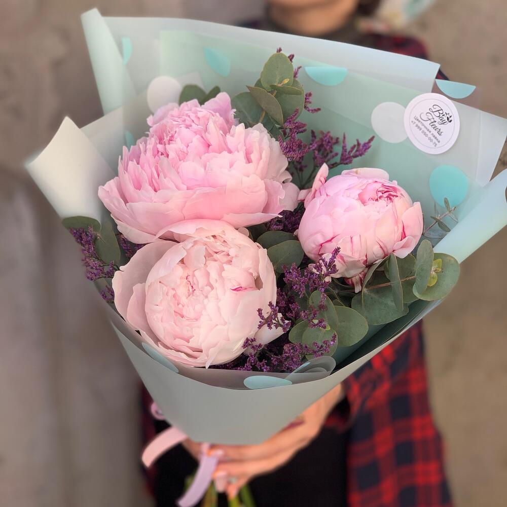 Пион Сара Бернар – 3 шт.зелень декоративная – 3 шт.Лимониум – 2 шт.Упаковка дизайнерская – 1 шт.