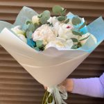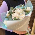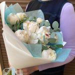 Букет пионовидных роз с кустовыми и эвкалиптом