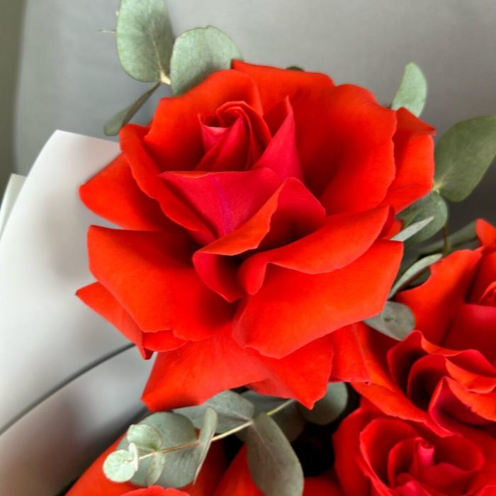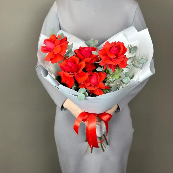 Эвкалипт – 1 шт.Лента атласная – 1 шт.Французская роза – 5 шт.Тишью белое – 1 шт.Дизайнерская упаковка – 1 шт.