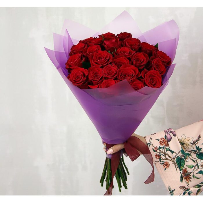 Роза Эквадор – 25 шт.Пленка – 2 шт.Лента – 1 шт.