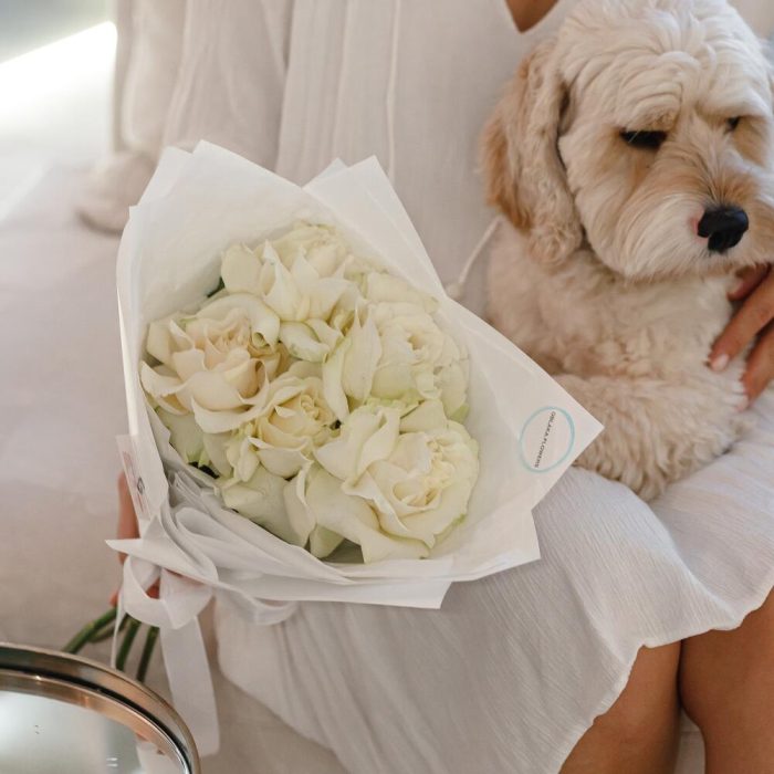 Роза французская – 5 шт.Тишью – 2 шт.Корейская пленка – 2 шт.Лента атласная – 1 шт.инструкция по уходу за цветами – 1 шт.Пакет крафтовый – 1 шт.