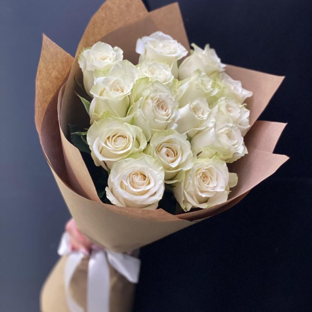 белые розы – 15 шт.Крафт дизайнерский – 2 шт.Лента атласная – 1 шт.работа флориста – 1 шт.