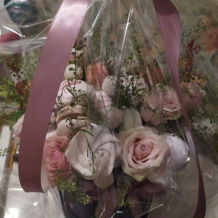 Раффаэлло – 20 шт.Упаковка дизайнерская – 1 шт.Шляпная коробка с лентами – 1 шт.Зефир ручной работы – 10 шт.Зефир ванильный – 6 шт.зелень декоративная – 10 шт.розы – 9 шт.