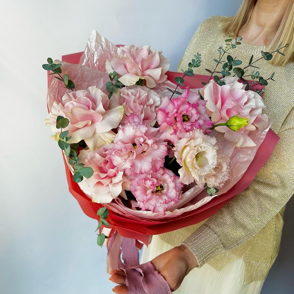 Эвкалипт – 3 шт.Тишью – 2 шт.Фисташка – 3 шт.Упаковка дизайнерская – 1 шт.Роза французская – 5 шт.Лизиантус махровый – 3 шт.лента текстильная – 1 шт.