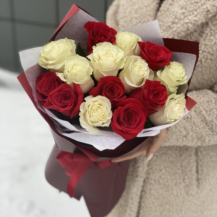Букет Влюбленный взгляд из 15 красных и белых роз в оформлении