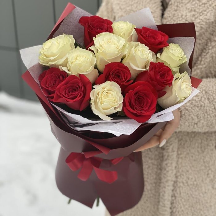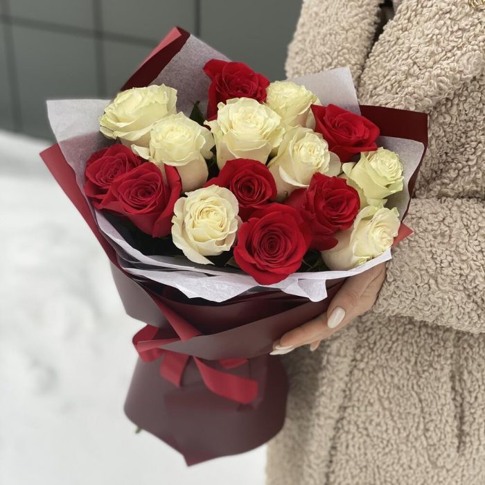 Букет из красных и белых роз в стильном оформлении!