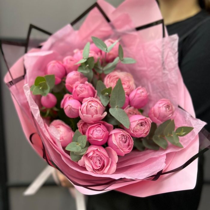Эвкалипт – 3 шт.Лента атласная – 2 шт.Тишью – 2 шт.Пленка матовая – 4 шт.пленка дизайнерская с каймой – 2 шт.роза кустовая пионовидная сильва пинк – 5 шт.