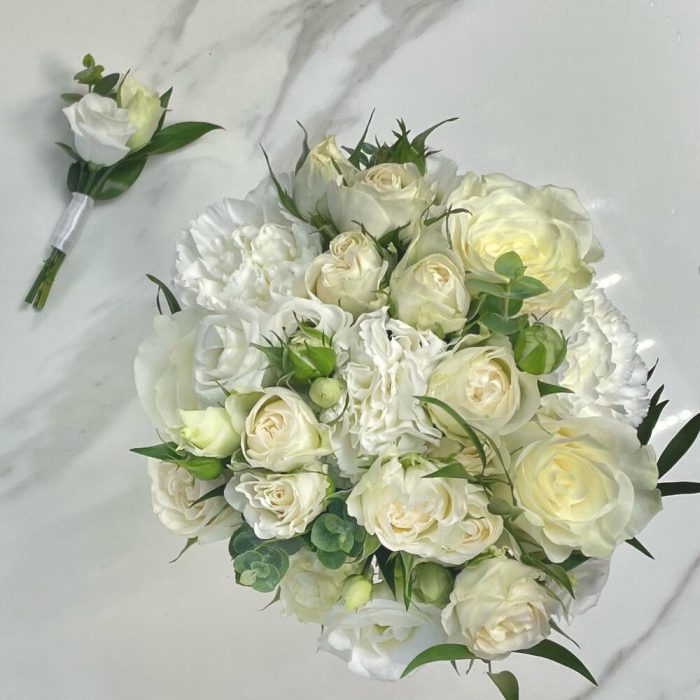 Лизиантус – 2 шт.Роза кустовая – 2 шт.Рускус – 1 шт.Эвкалипт – 1 шт.Роза одноголовая – 3 шт.Гвоздика сортовая – 3 шт.Лента атласная – 1 шт.Фисташка – 1 шт.Бутоньерка – 1 шт.Булавка – 1 шт.
