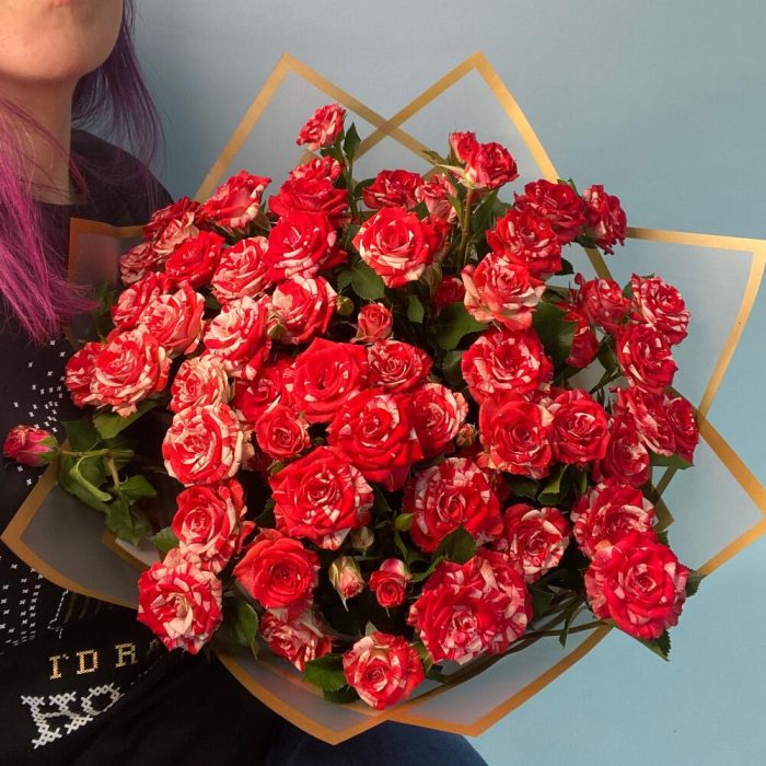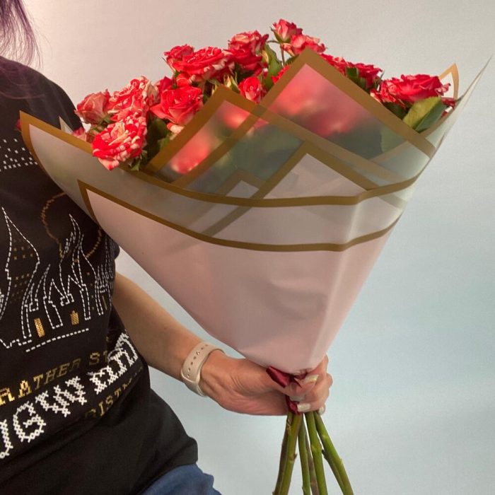 Кустовая роза – 7 шт.Упаковка дизайнерская – 2 шт.Лента атласная – 1 шт.