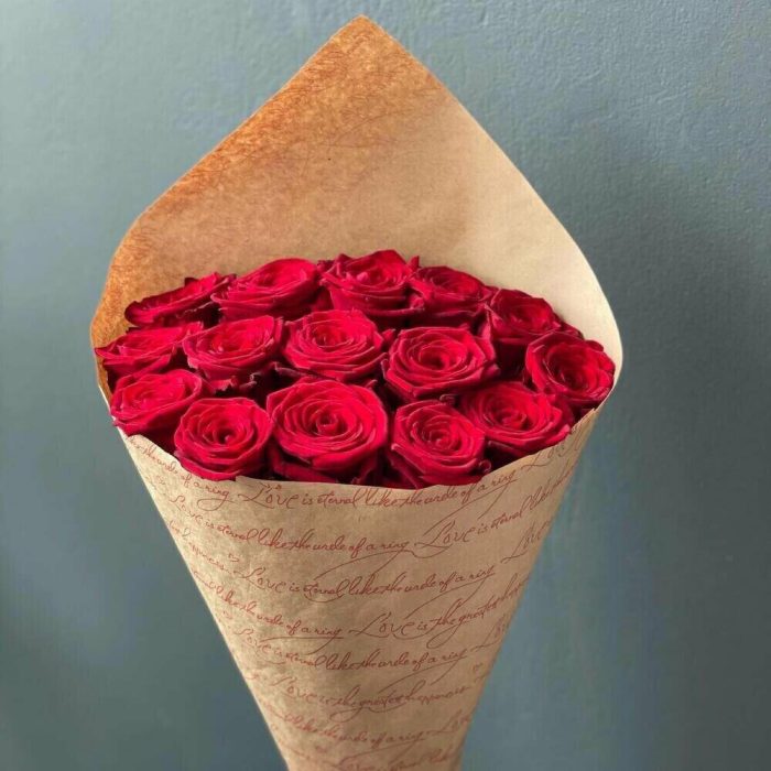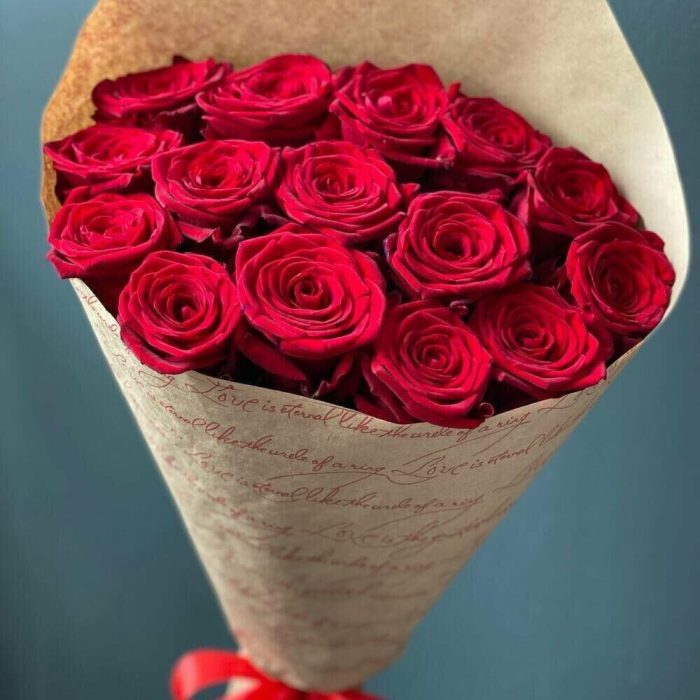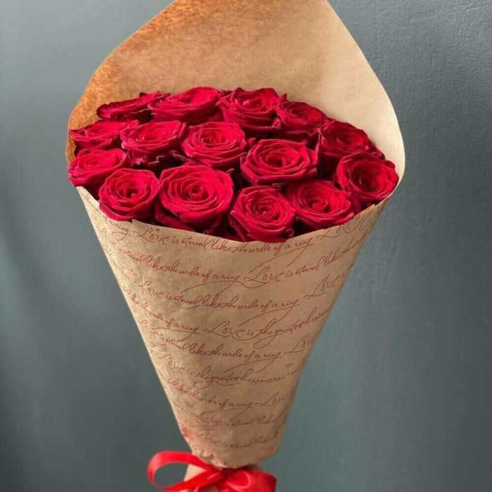 Лента – 1 шт.Крафт упаковка – 2 шт.розы эквадор (60 см) – 15 шт.
